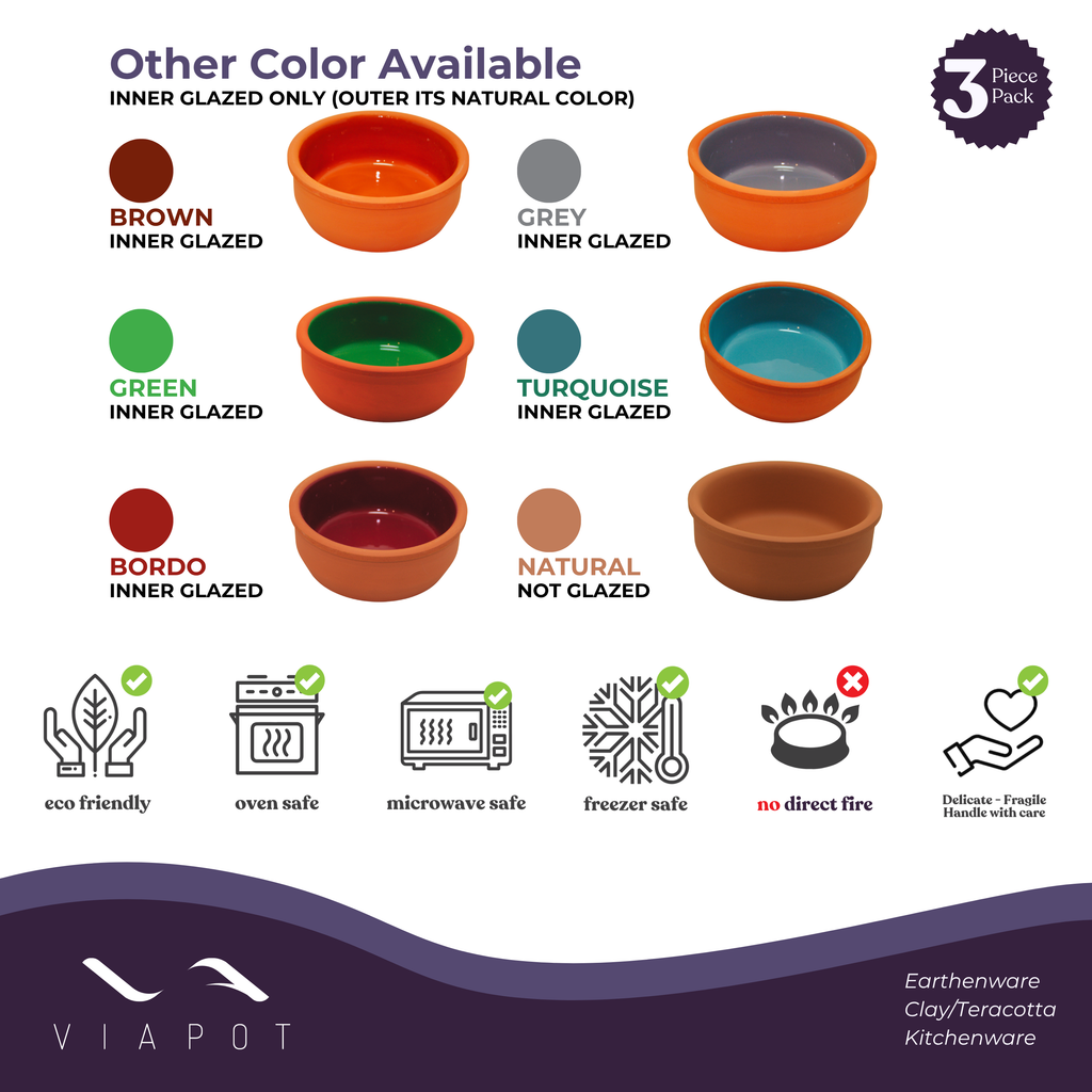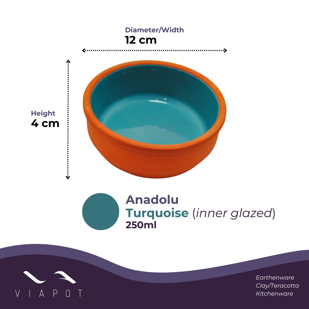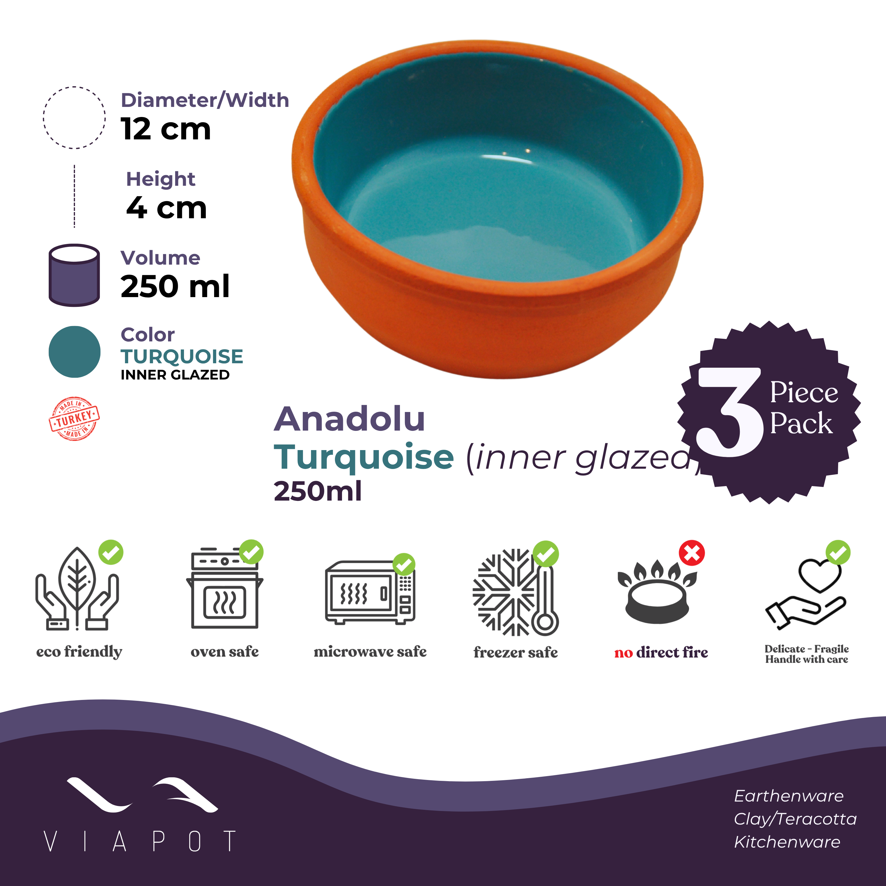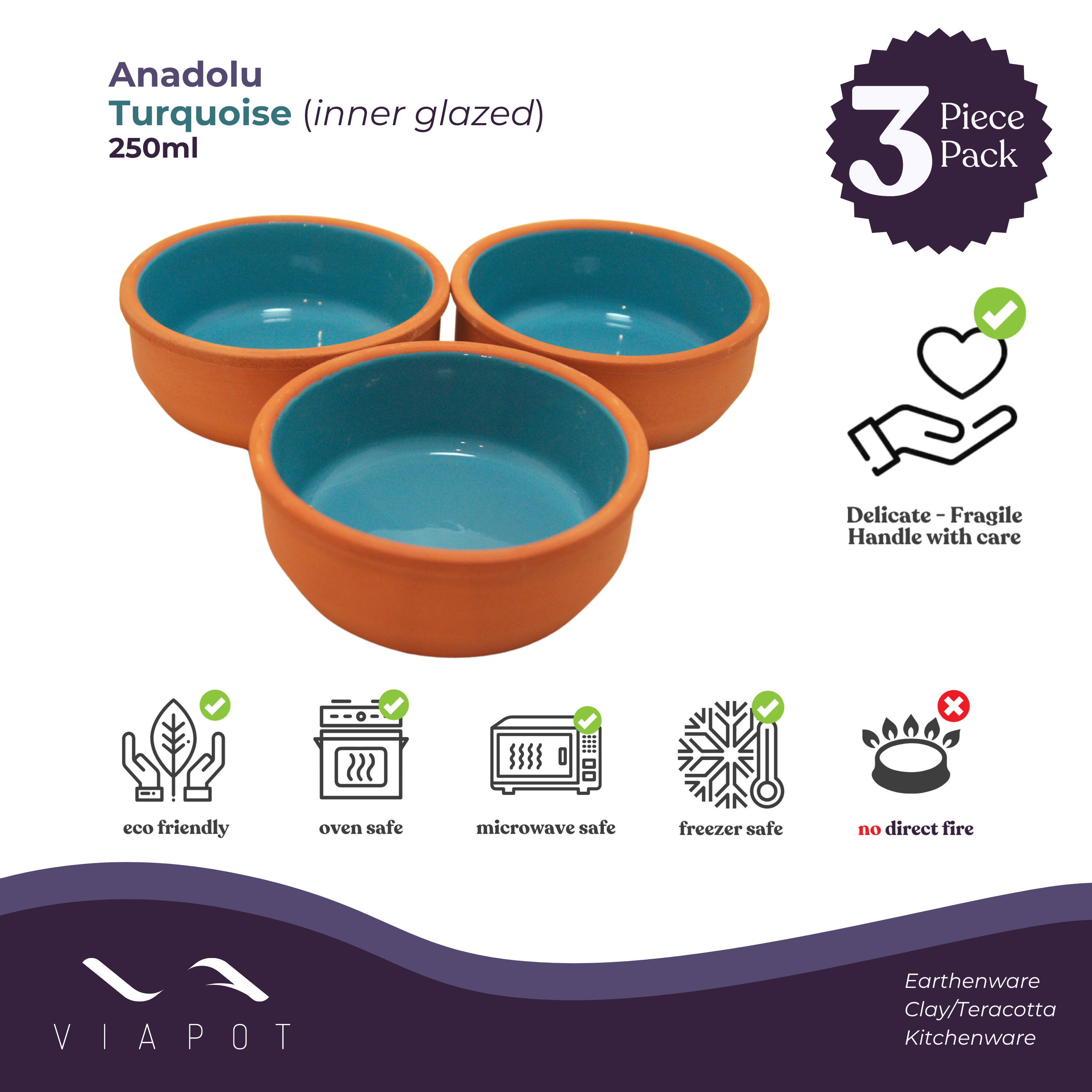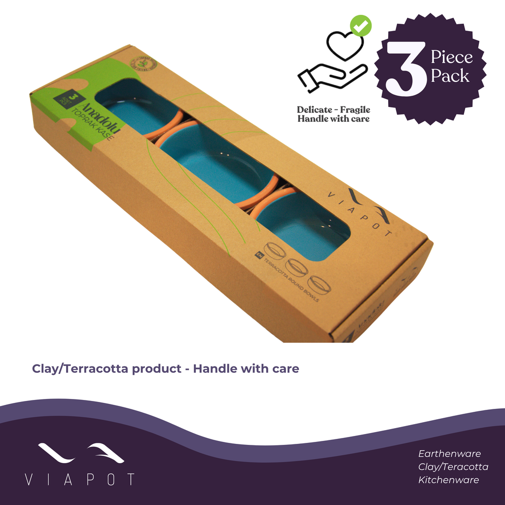 Viapot Anadolu Premium Terracotta/Clay Katori & Bowls | Turquoise (Inner Glazed) Food Safe | Set of 3 Bowls